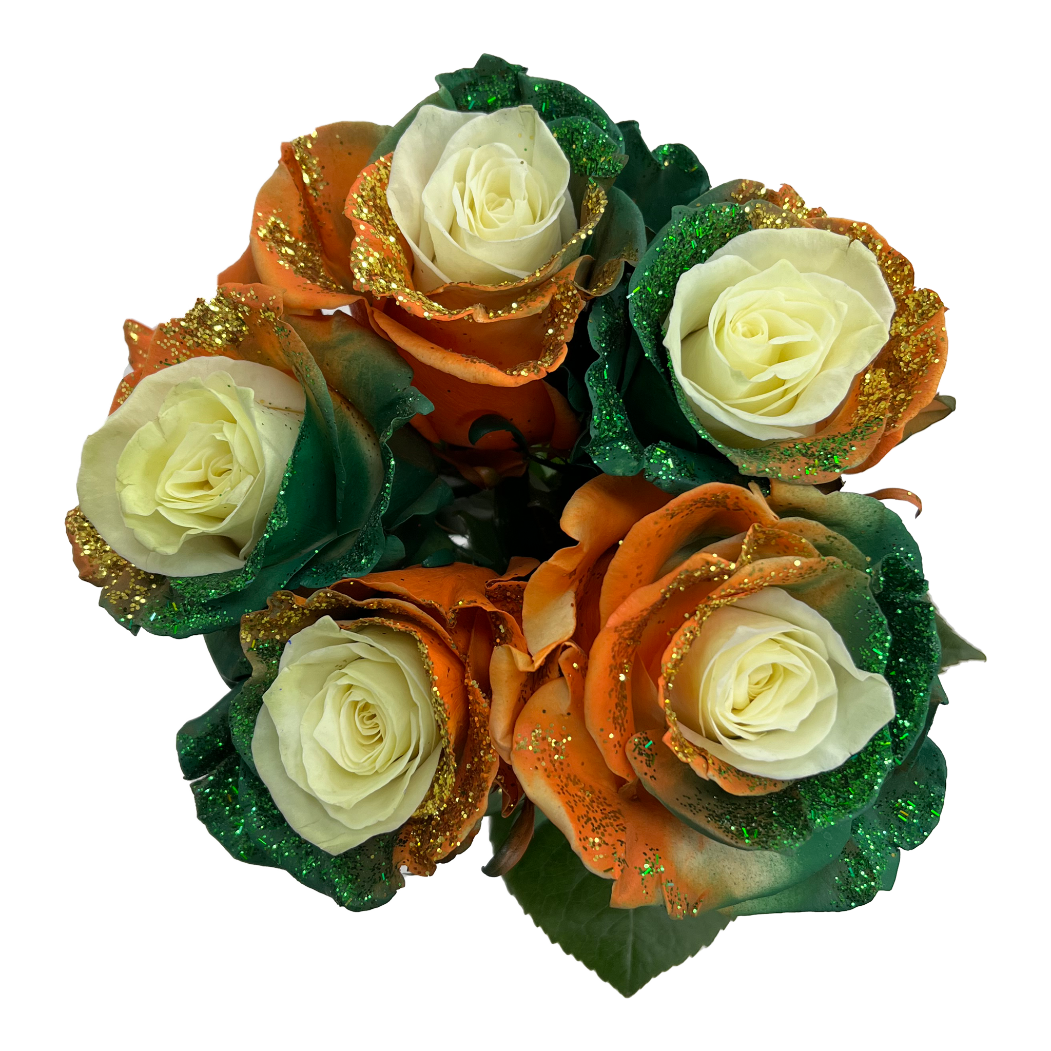 Show off your Irish pride with Blarney Point! Featuring a dazzling blend of orange, green, white, glitter, sparkle, and roses in traditional Irish colors, these unique roses will make for a lively day. People will be green with envy over this rainbow of fun!
